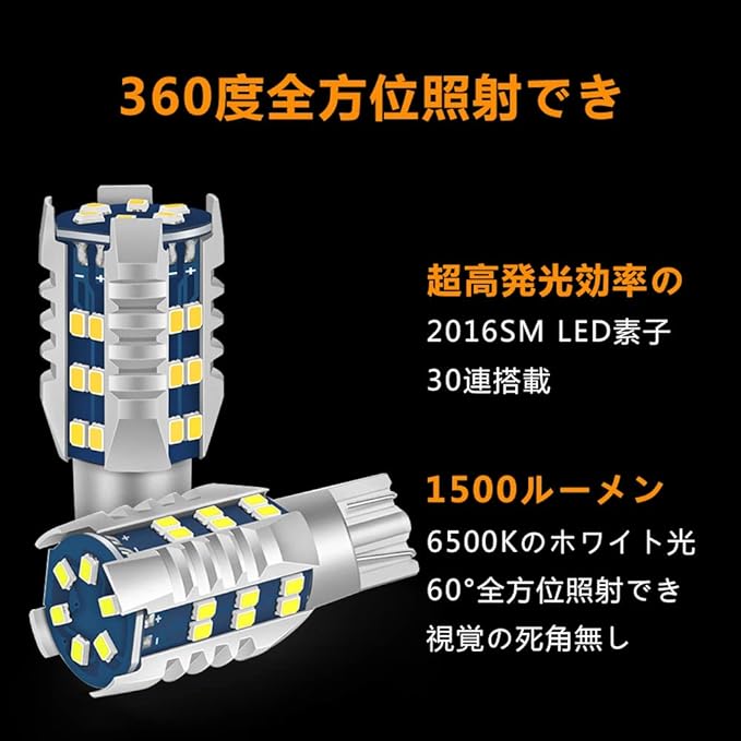 【 T16 LED ホワイト 2個】バックランプとしか使われません。最先端超高発光効率の2016LED素子30個搭載、360 全方位照射でき、CANBUSキャンセラー内蔵で大部分車種はエラーフリー、12V/24V車用T16LEDバルブ2個セット。