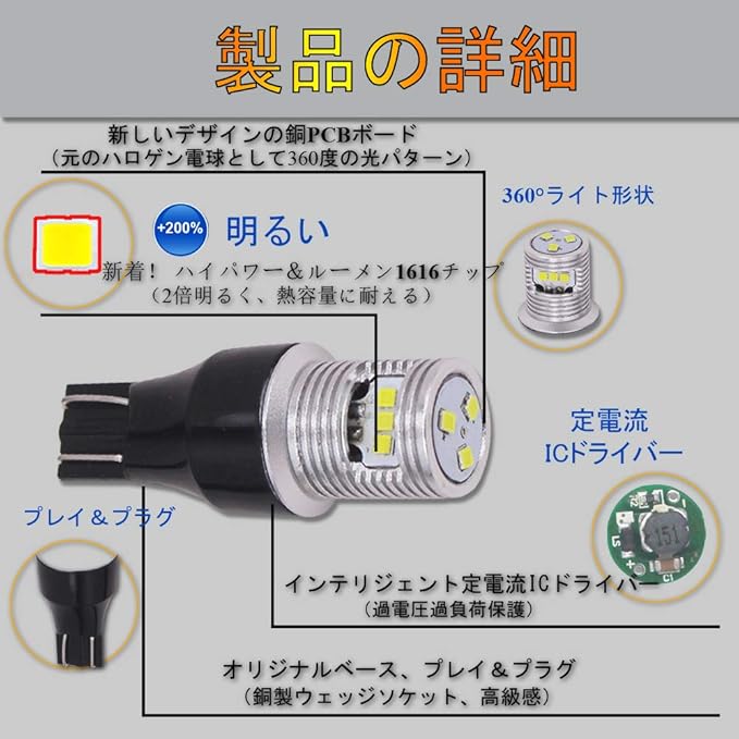 【標準T16ソケット】:T16、T15、W16W、912、921、906、904、902などに適しています。バックランプ直接交換品です。極性フリーで、取付は簡単。