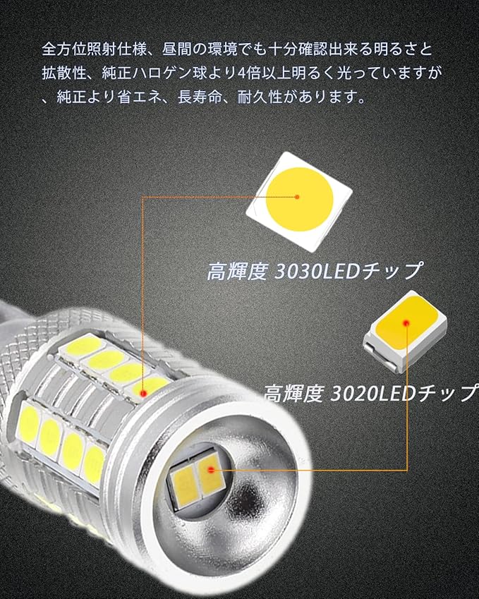 【超高輝度&省エネルギー】2000LMの明るさ、超高輝度な6000Kホワイト光、11Wの消費電力だけ、市販のハロゲン(パワー:18W)より省エネルギーの上で、明るさは大幅にアップ!視認性を重視され、後方照射用の光を足しています。暗い場所でバックカメラから後方をはっきり見て、後部の不慮の事故などを防ぎます。