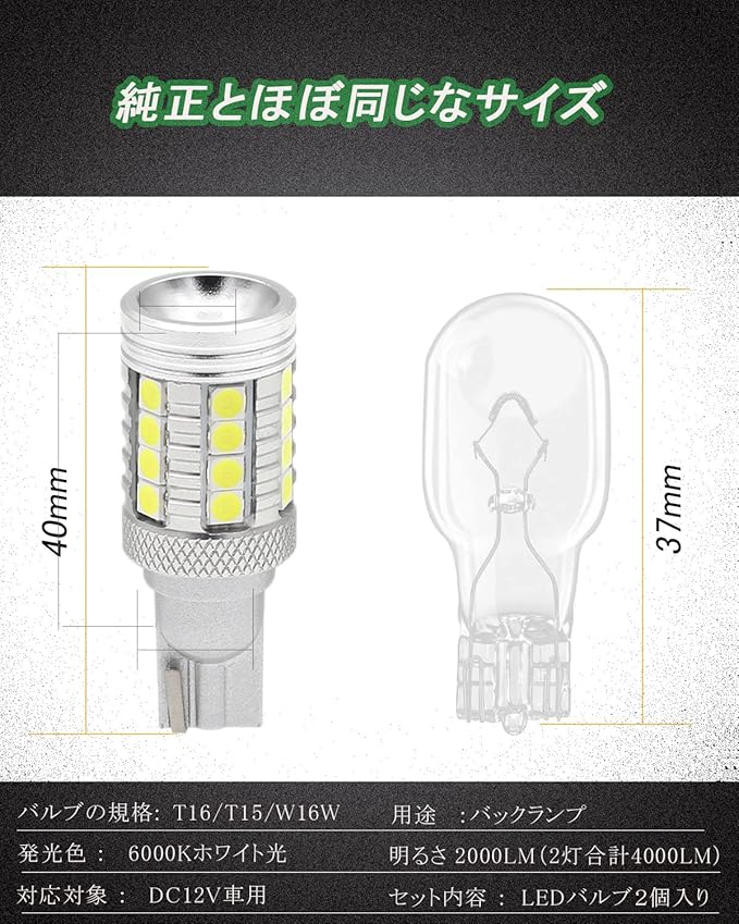 【極性フリー&取付簡単】純正球(T16)とほぼ同じサイズなので、極性フリーで、取付は簡単!原箇所のまま差し込むだけで取付ます。【適用ソケット】:T16、T15、912、921、906、904、902、W16W