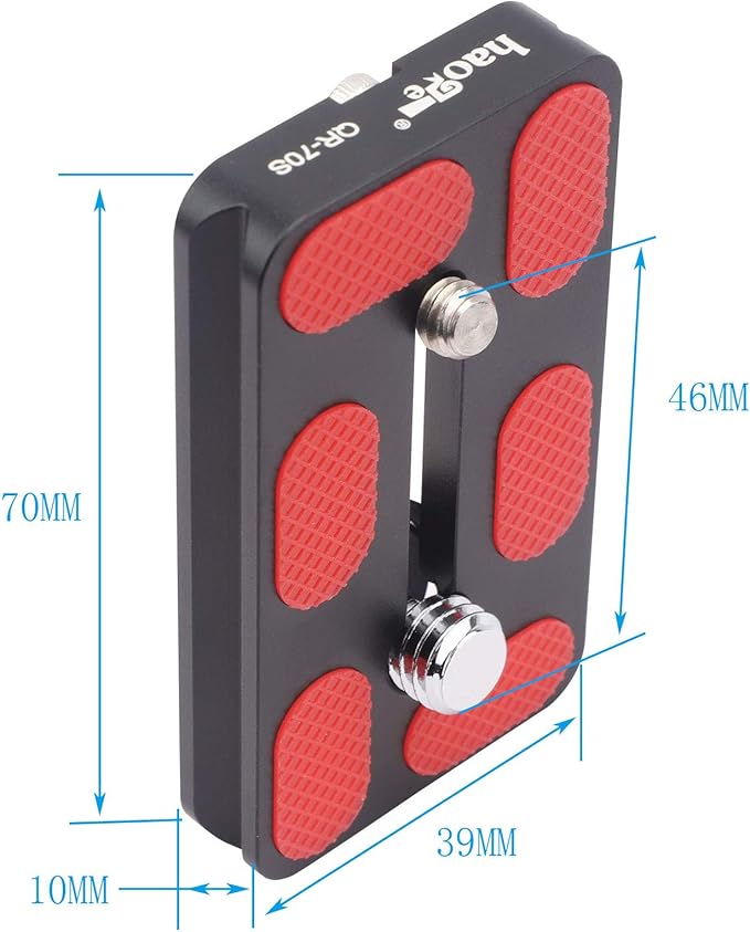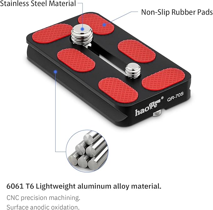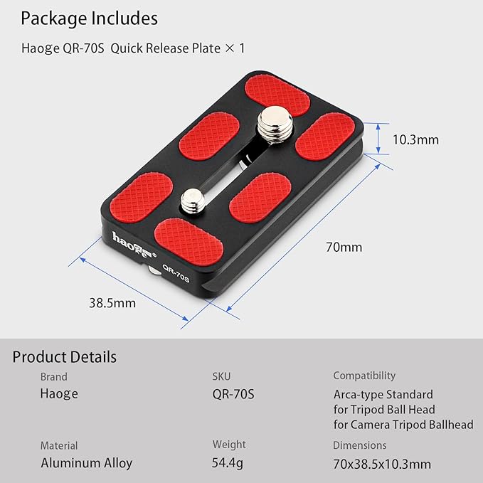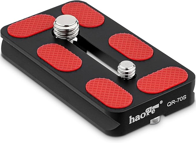 このHaoge QR-70Sクイックリリースプレートには、1/4インチと3/8インチのネジが付いています。 コイン対応ネジ。 ゴム引きの表面と滑り止めピンが付いています。 特別な滑り止めゴムパッドが、各プレートと取り付けられたギアの間のグリップを強化し、取り付けによる損傷からギアを保護します。 Arca-Swiss規格の三脚ボールヘッド、カメラ三脚ボールヘッドに対応。 Haoge QR-70S x 1。