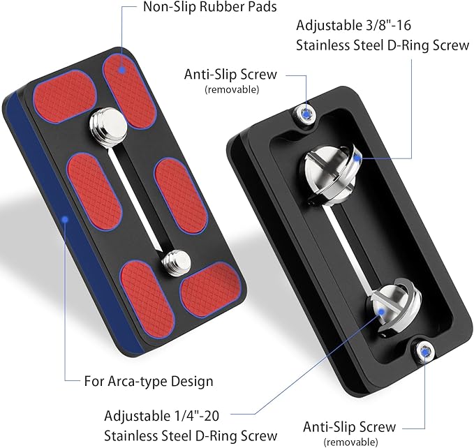 プレートはすべてのArca Swissリリースシステムと互換性があります。 1/4インチと3/8インチのネジを装備。