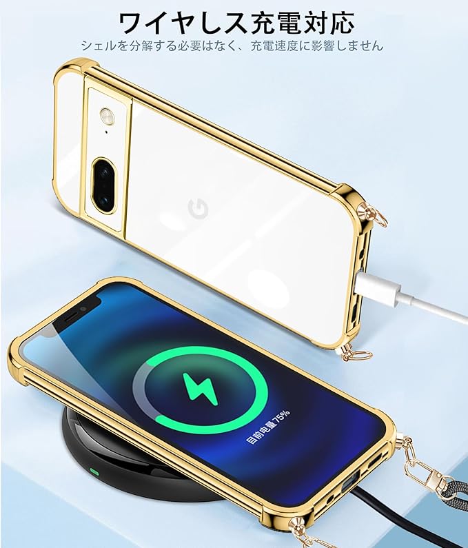Pixel 8 ケース クリア ショルダー 耐衝撃 グーグル ピクセル 8 スマホケース 薄型 TPU 軽量 肩がけ 首掛け 紐付きバンパー カバー ストラップ付き ストラップホール付き 韓国 透明 ストラップ着脱可 調節 ワイヤレス充電 全面保護 落下防止 すり傷防止 カメラ保護(ゴールド)