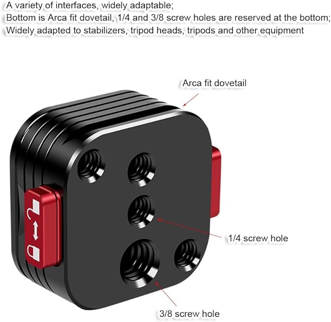 3. 1/4インチのネジ頭と様々なインターフェースを持ち、広く適応可能; 底面はアルカスイス互換のダブテイルで、底に1/4インチと3/8インチのネジ穴が用意されています; スタビライザー、三脚ヘッド、三脚およびその他の機器に広く適応しています。