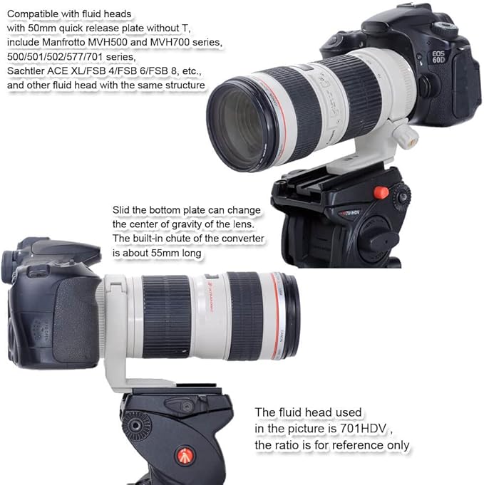 2. Tなしの50mmクイックリリースプレートを備えた流体ヘッドと互換性があり、Manfrotto MVH500およびMVH700シリーズ、500/501/502/577/701シリーズ、Sachtler ACE XL / FSB 4 / FSB 6 / FSB8などが含まれます。同じ構造の流体ヘッド。