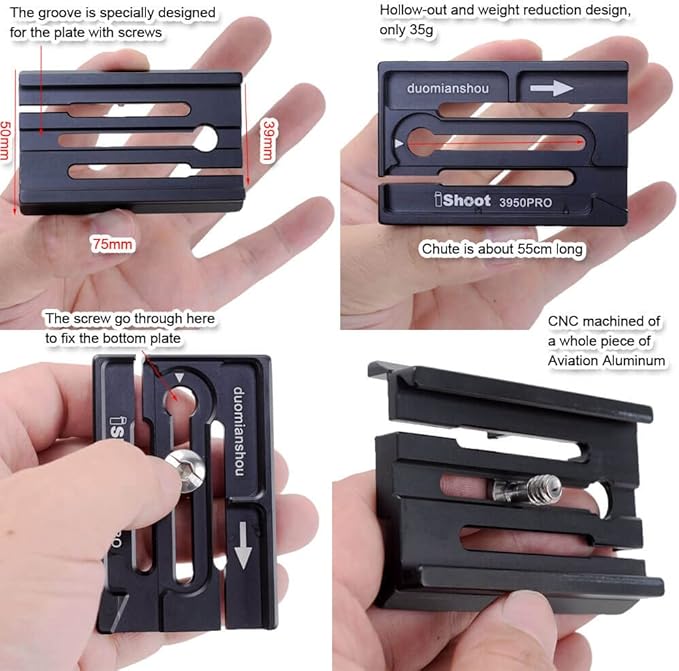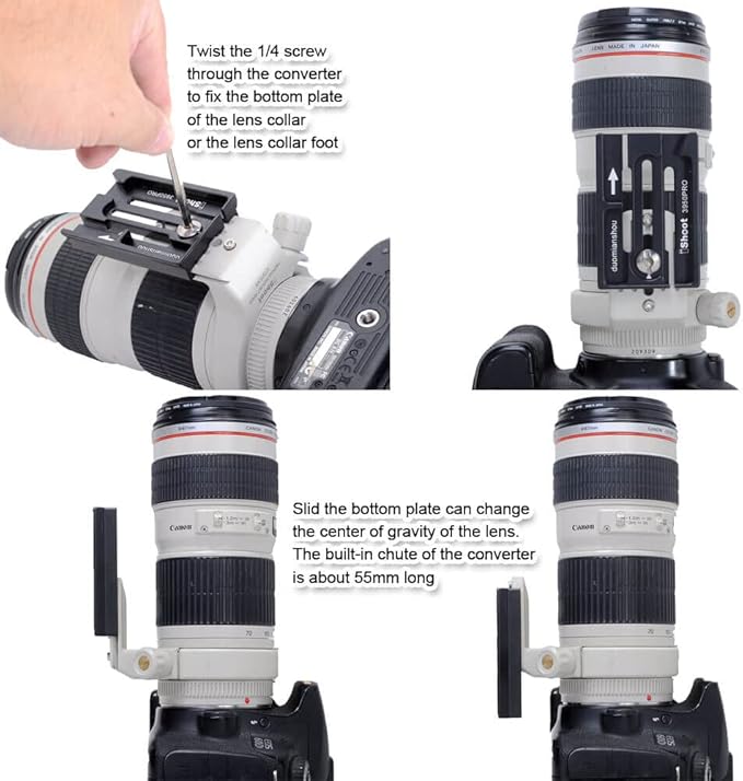 3. 1/4ステンレス鋼ネジをコンバーターにねじり、クイックリリースプレートを固定します。コンバーターの内蔵シュートの長さは約55mmで、底板をスライドさせるとレンズの重心が変わる可能性があります。