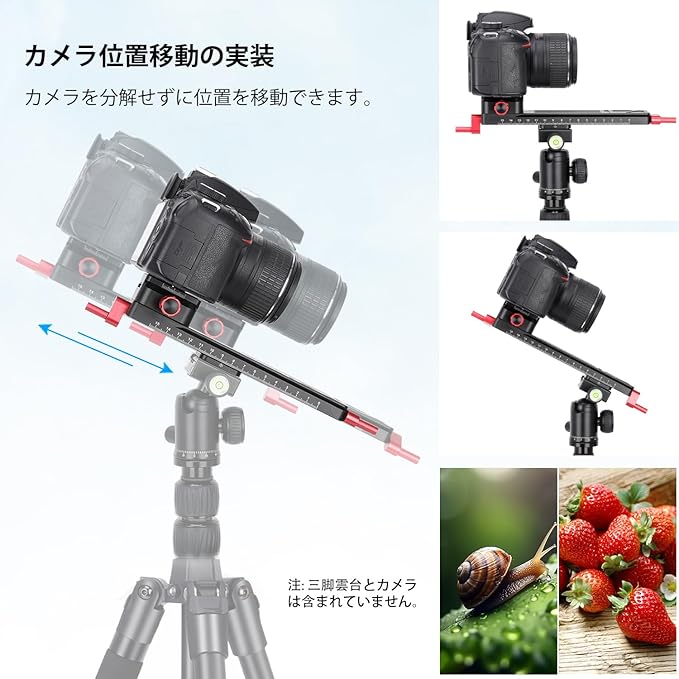 【ユニバーサル】マクロフォーカスレールには、3/8"ネジソケットを備えたArcaスタイルのダブテールが付いています。Arca-Swiss用の統合クイックリリースプレートは、Arcaタイプの三脚やスタビライザー、三脚、一脚、スタビライザー、ジンバル、ボールヘッドに簡単にフィットします。
