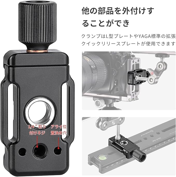 クランプはL型プレートやYAGA標準の拡張クイックリリースプレートが使用できます。底面の1/4-20ネジ穴を外部マジックハンドの拡張ポートとして使用し、フィルインライトやマイク、携帯クリップなどのアクセサリーをリンクさせることが可能です。
