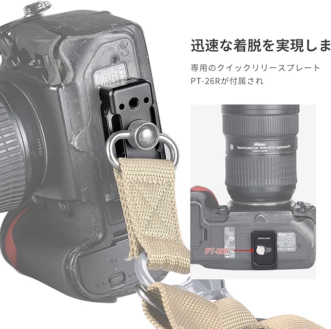 QDヘッドカメラストラップSTR-01、アジャイルクイックリリースPT-26Rを使用するためのQDホールを中央に配置。カメラを持ち運ぶ際に、素早く脱着することができます(他のYAGA標準クイックリリースプレートにも使用可能です)。