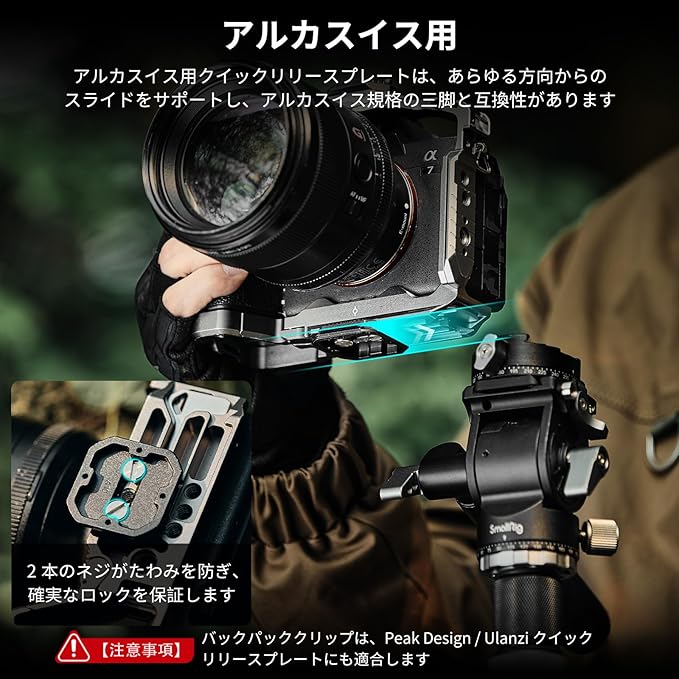 【Arca-Swiss対応】Arca-Swiss用クイックリリースプレートは、あらゆる方向からのスライドに対応し、Arca-Swiss規格の三脚と互換性があります。バックパッククリップは、Peak Design対応 / Ulanzi対応クイックリリースプレートにも適合します。