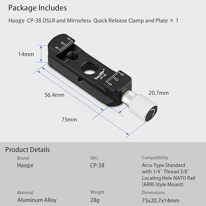 Haoge CP-38 NATOレールとミラーレスクイックリリースクランプとプレート アルカタイプ標準用 1/4インチスレッド3/8インチ位置決め穴NATOレール(ARRIスタイルマウント)