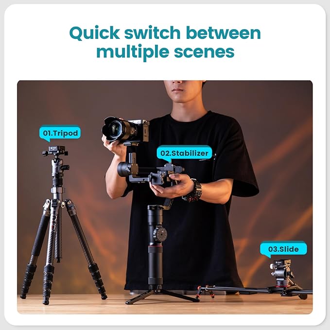 マルチシーン切り替え: 手持ち撮影・三脚・スタビライザー・モノポッド・スライドレールなど、様々なシチュエーションでシームレスに接続可能。撮影のスピードアップに貢献します