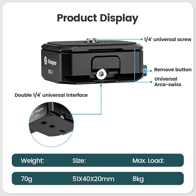 高品質素材: Fotopro RZ-2クイックリリースプレートは高品質アルミニウム合金製で軽量ながら強度に優れています。重量はわずか0.06kg、最大耐荷重は8kgと高い耐久性を誇ります