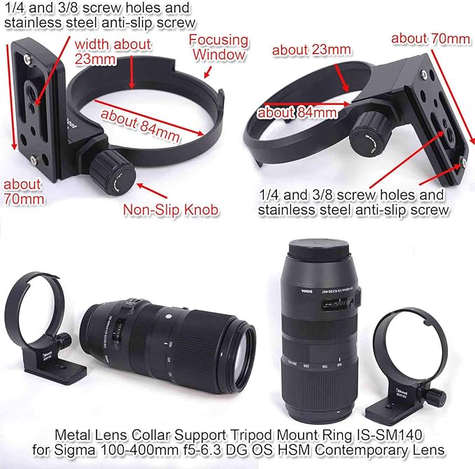 このレンズブラケットはシグマSigma 100-400mm f/5-6.3 DG OS HSM Contemporary (Canon EF Mount and Nikon F Mount)レンズのために特別に設計;Sigma 100-400mm F5-6.3 DG DN OSレンズおよびその他のレンズとの互換性はありません。