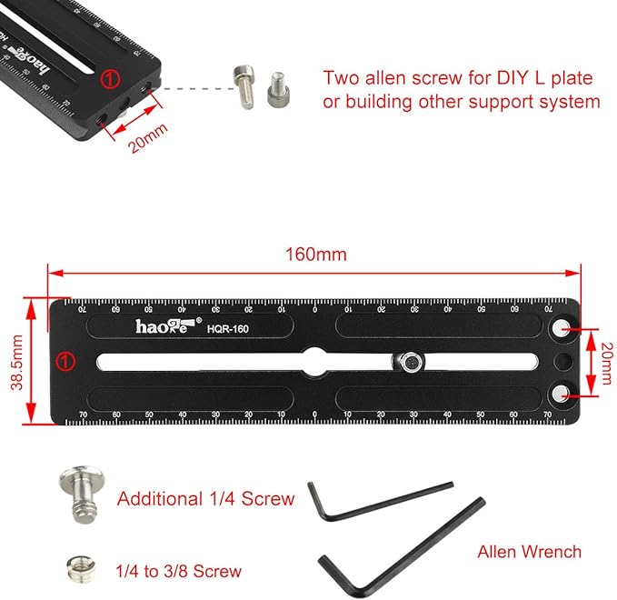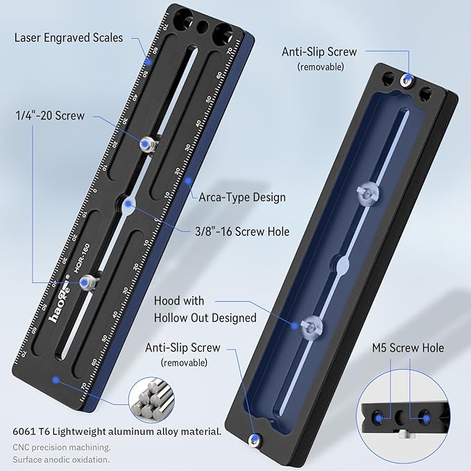 Haoge HQR-160ユニバーサルクイックリリースロングプレートは、アルカタイプ対応の多目的レールで、両側に1mm刻みのレーザー刻印された参照スケールが付いています。 節点調整が簡単にできます。 プレートの端には、DIYLプレートやその他のサポートシステムを構築するための4つの穴があります。