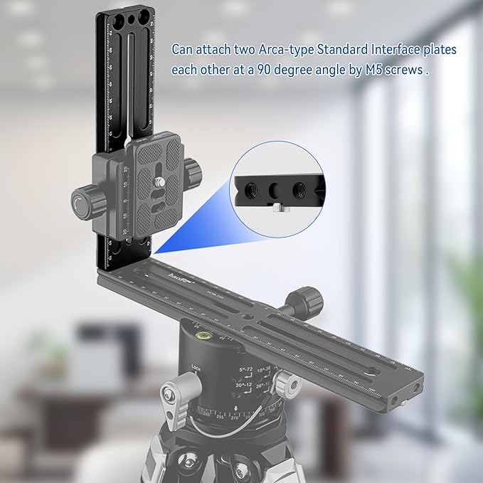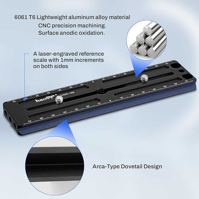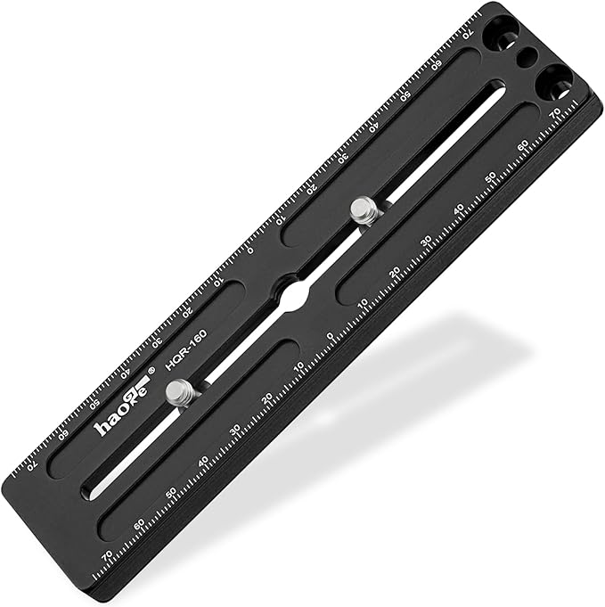 Haoge HQR-160ユニバーサルクイックリリースロングプレートは、アルカタイプ対応の多目的レールで、両側に1mm刻みのレーザー刻印された参照スケールが付いています。