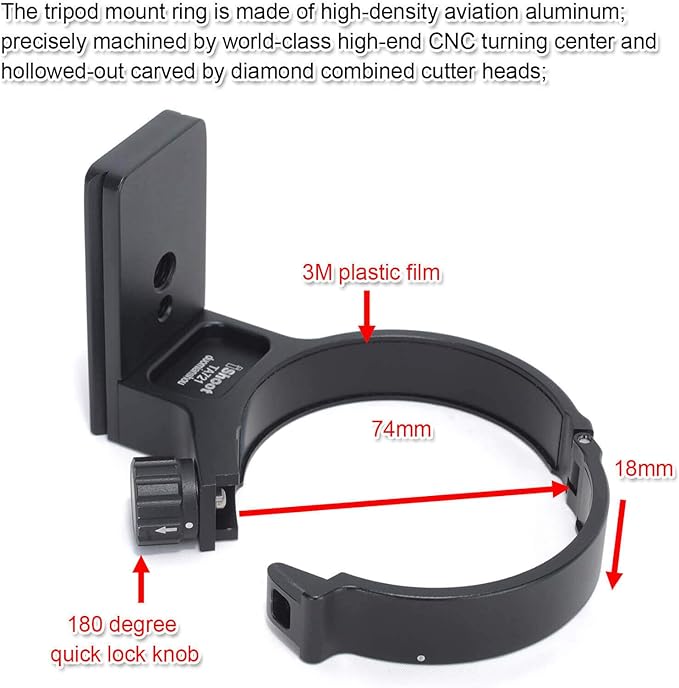 4. リング内の3Mプラスチックフィルムは、レンズの表面摩耗を低減します。 底部には取り外し可能な滑り止めネジと1/4および3/8ネジ穴があり、適用範囲は広くなっています。