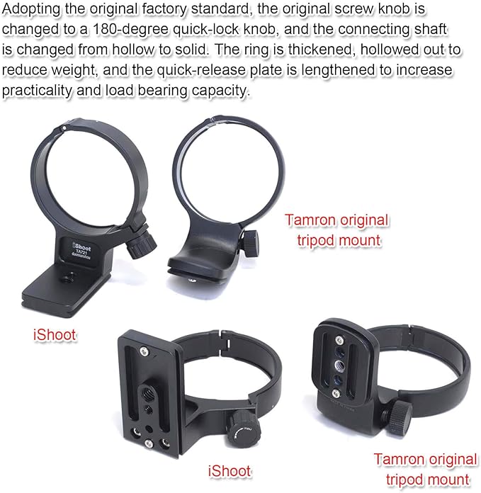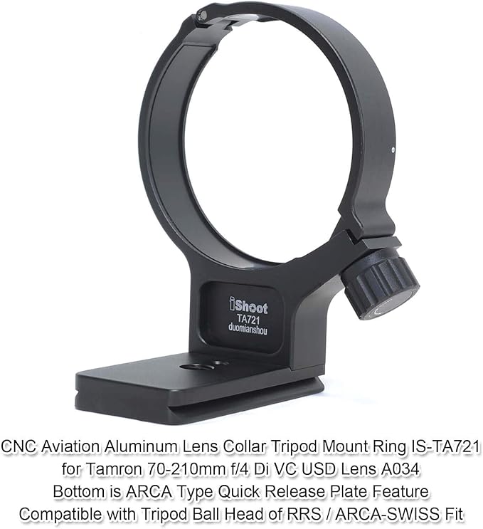iShoot 金属 タムロン 望遠ズームレンズ TAMRON 70-210mm F4 Di VC USD A034 (ニコン F、キヤノン EF 用)のリング式三脚座、レンズサポート襟、三脚マウントリング, ボトムは Arca-Swiss タイプのクイックリリースプレート, 1/4"と 3/8"ネジ穴付き