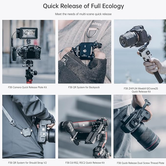 クイックリリーストッププレートは標準の38mmアルカマウントと互換性があり、カメラをボトムプレートに取り付けると、F38クイックリリースボトムプレートを使用してさまざまなデバイスをすばやく切り替えることができます。さまざまな種類のカメラを接続するために使用できます。すぐに取り付けおよび取り外しができるので、効率的な作業につながります。