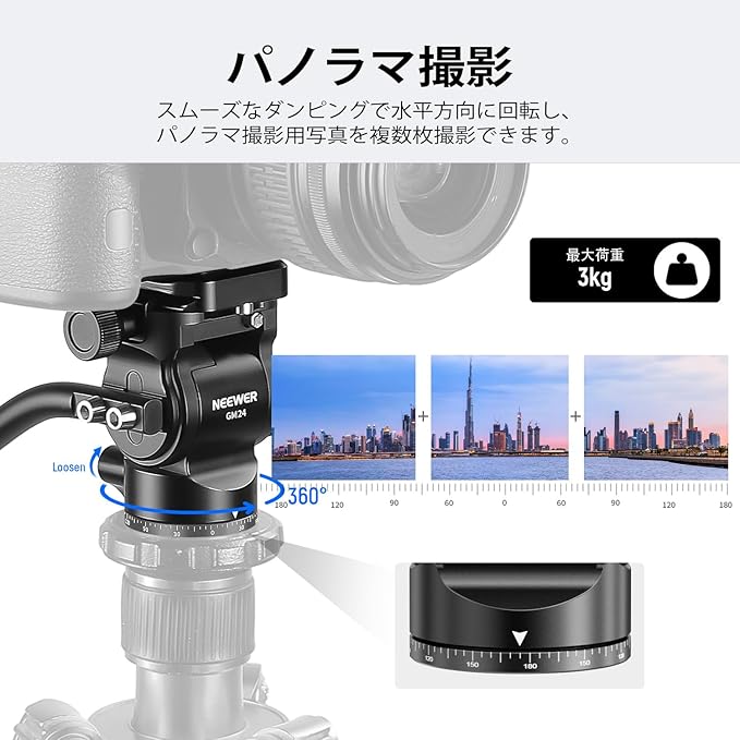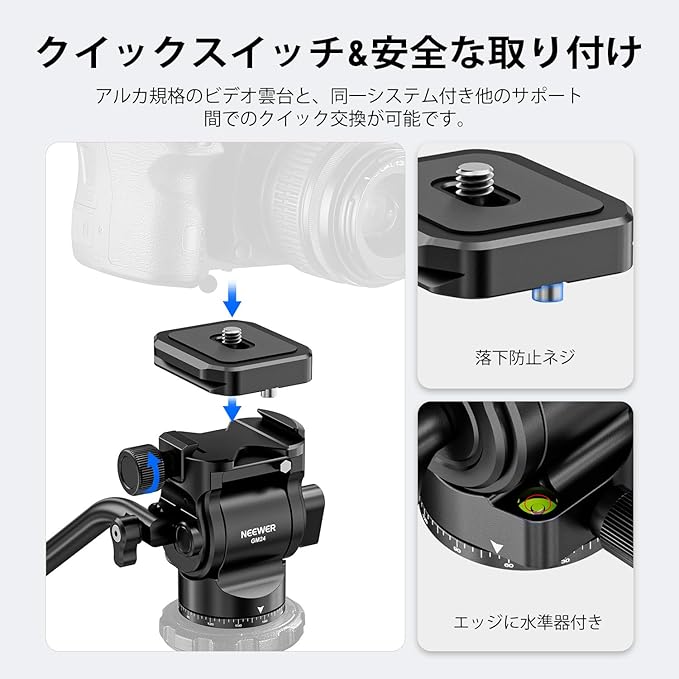 NEEWER 三脚ビデオヘッド フルード雲台ヘッド クイックリリースプレート&ハンドル/Φ37mmスケールベース付き 金属製パンチルト カメラ三脚マウントアダプター Arca Swiss 互換 コンパクト 小型 ビデオカメラ/DSLRカメラ用 耐荷重3kg GM24 ブラック