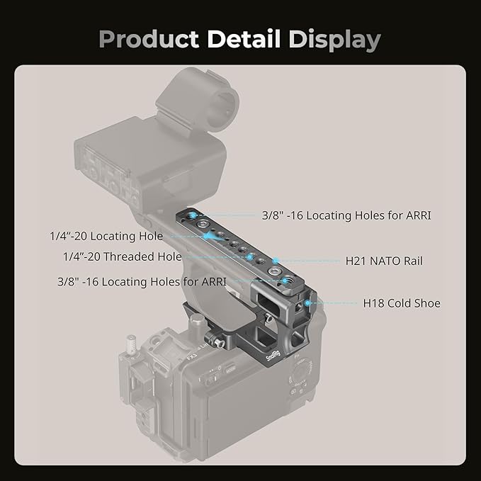 【複数の取り付けポイント】内蔵の1/4"-20ネジ穴、3/8"-16 ARRI用ロケーションホール、1/4"-20ロケーションホールを備え、マイク、モニター、マジックアームなどのアクセサリーを取り付けることができ、さまざまな撮影ニーズに対応します。